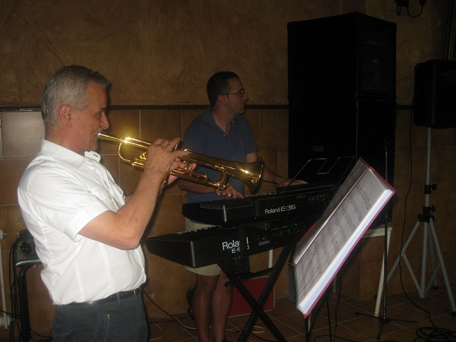 Pero la gente tenia ganas de alegría y de cachondeo. Una orquesta con órgano eléctrico y trompeta, anima le fiesta. En mi mesa estaba el trompetista, al que a partir de ahora yo llamaré Pedro el trompetista; un poco más allá Pedro Morgado, cuyo hermano reside en Canadá y hasta se atreve a leer mis blogs ¡qué habré hecho yo Dios mio para tanto honor!. Y a mi derecha Mauri Coronado, nieto del señor Mauri, el de la calle Palacio, donde vivo y con kl que hice la primera comunión en Las Carmelitas junto a Rufino, otro de los asistentes al encuentro junto a su esposa, una de las hijas del señor Eumenio el cobrador del coche “directo”, con el que siempre me llevaba muy bien. Es en mi pueblerina mesa camilla de la calle Palacio de Brozas donde yo escribo ahora este blog. Termino con Aure Barriga, la de la calle Aldehuela, a la que la cámara de Carlos la coge hablando de política. ¡Uy, qué despiste!