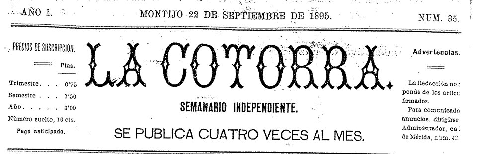 Era director del semanario “La Cotorra”, Juan Antonio Codes Rodríguez; su administración estaba en la calle Mérida núm. 42, el número suelto costaba diez céntimos y la suscripción anual tres pesetas.