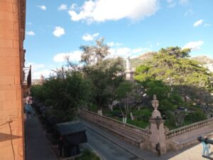 Por último, la foto fue tomada desde uno de los balcones del primer piso de la antigua casa natal del muy ilustre zacatecano: el doctor Juan Ignacio María de Castorena Goyeneche y Villarreal, considerado primer periodista de México, amigo personal y defensor de la obra de Sor Juana Inés de la Cruz, autor de una veintena de libros y murió siendo Obispo de Yucatán, en cuya catedral reposan sus restos. En una parte de esta casa se encuentra una de las primeras y más famosas rosticerías de la ciudad: El Pastor… pero esa, es otra historia…