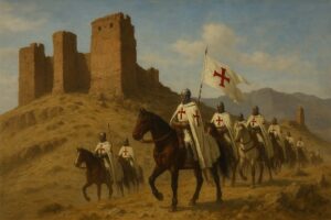 Foto: «La Orden de Santiago llega» – Caballeros y fe. Un grupo de caballeros a caballo, con capas blancas y cruces rojas, se acerca a una fortaleza mora. Los colores contrastan con las colinas polvorientas de España. (Foto imaginaria).