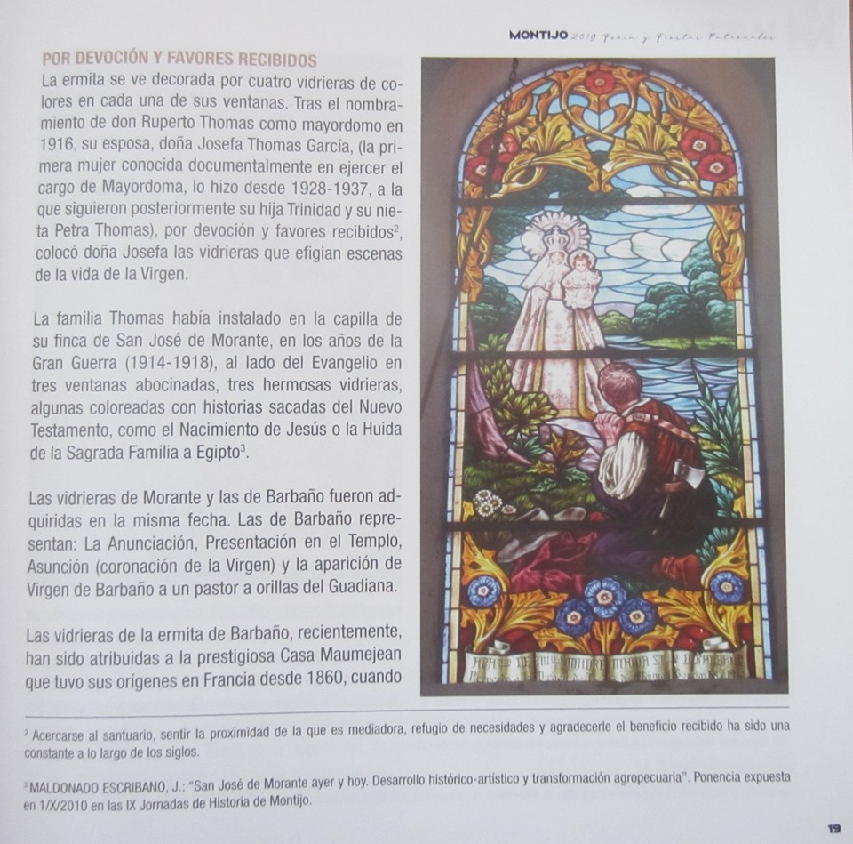 Es uno de mis artículos de colaboración con la Revista de Feria y Fiestas Patronales de Montijo 2019, como Cronista Oficial. Las cuatro vidrieras que hay en la ermita de la Patrona de Montijo fueron adquiridas por la familia Thomas (don Ruperto y doña Josefa) en la segunda década del siglo XX. Efigian La Anunciación, Presentación en el Templo, Asunción (coronación de la Virgen) y la aparición de Virgen de Barbaño a un pastor a orillas del Guadiana.