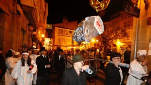 Pasaban las nueve de la noche cuando se levantó la capilla ardiente en la Praciña da Herba y, con las autoridades antroideiras tras la sardina, la siguieron largas filas de viveirenses con sábanas blancas y velas entonando canciones típicas del carnaval local.