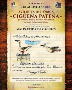 Aunque en las mismas se dejó de andar de un lado a otro y ahora se viven cómodamente desde una silla, sí se sigue haciendo ruta por multiples periodos, acontecimientos, personajes y escenarios de la historia local. En 2023 las protagonistas serán las cigüeñas, esas patilargas que todos los años se merecen una semana, que tan veneradas fueron por nuestros antepasados, que tantos malpartideños trajeron al mundo, que por ellas se nos conoce en toda Europa, que dejaron huella en nuestras tradiciones y monumentos en nuestras plazas y que por traer, llegaron a traernos a expertos naturalistas, biólogos, frailes poetas e incluso, nada más y nada menos, que a un príncipe.