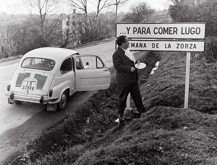 Ya estaba rodando el Seat 600 y en Lugo se adelantaron a las intenciones turísticas e idearon el cartel metálico que vemos en la fotografía…Y PARA COMER LUGO anunciando a su vez la “Semana de la Zorza” que es como denominan por aquella tierra gallega a nuestro picadillo de chorizo.